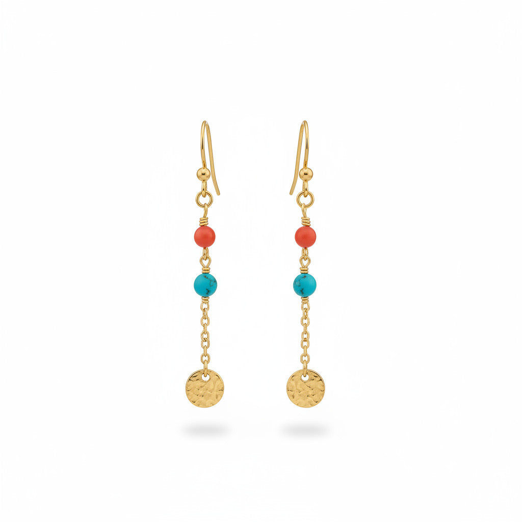 עגילי סטיינלס סטיל זהב עם דיסק מרוקע בשילוב חרוזים