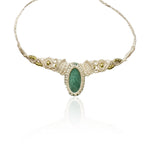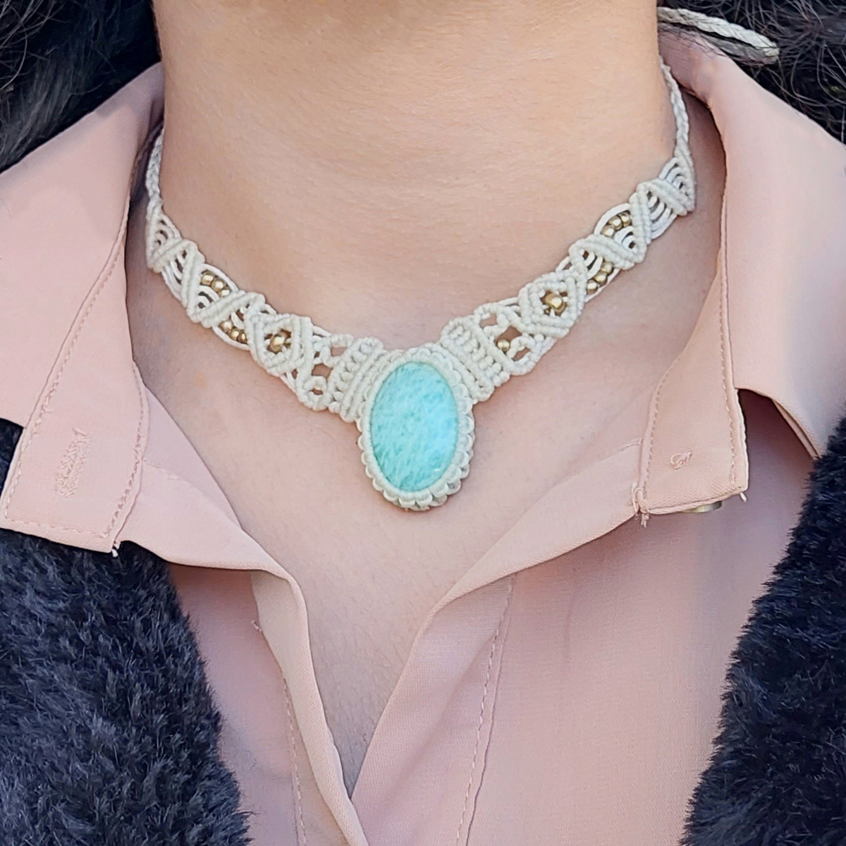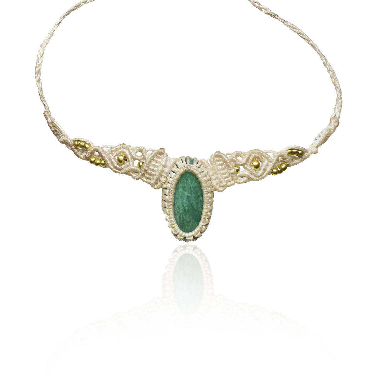 שרשרת מקרמה בעבודת יד בצבע שמנת עם אבן אמזונייט