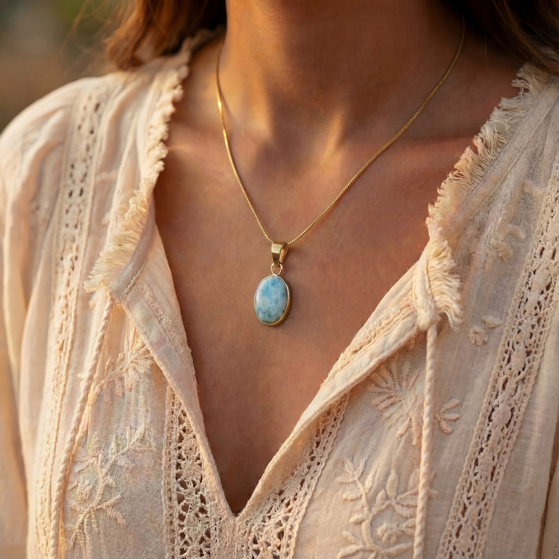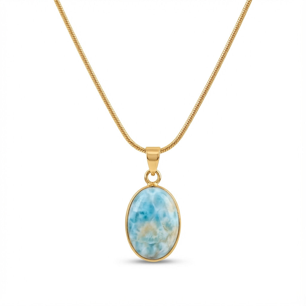שרשרת עדינה עם תליון לרימר טבעי בגוון תכלת-ים רגוע, משובץ במסגרת חלקה מצופה זהב.
