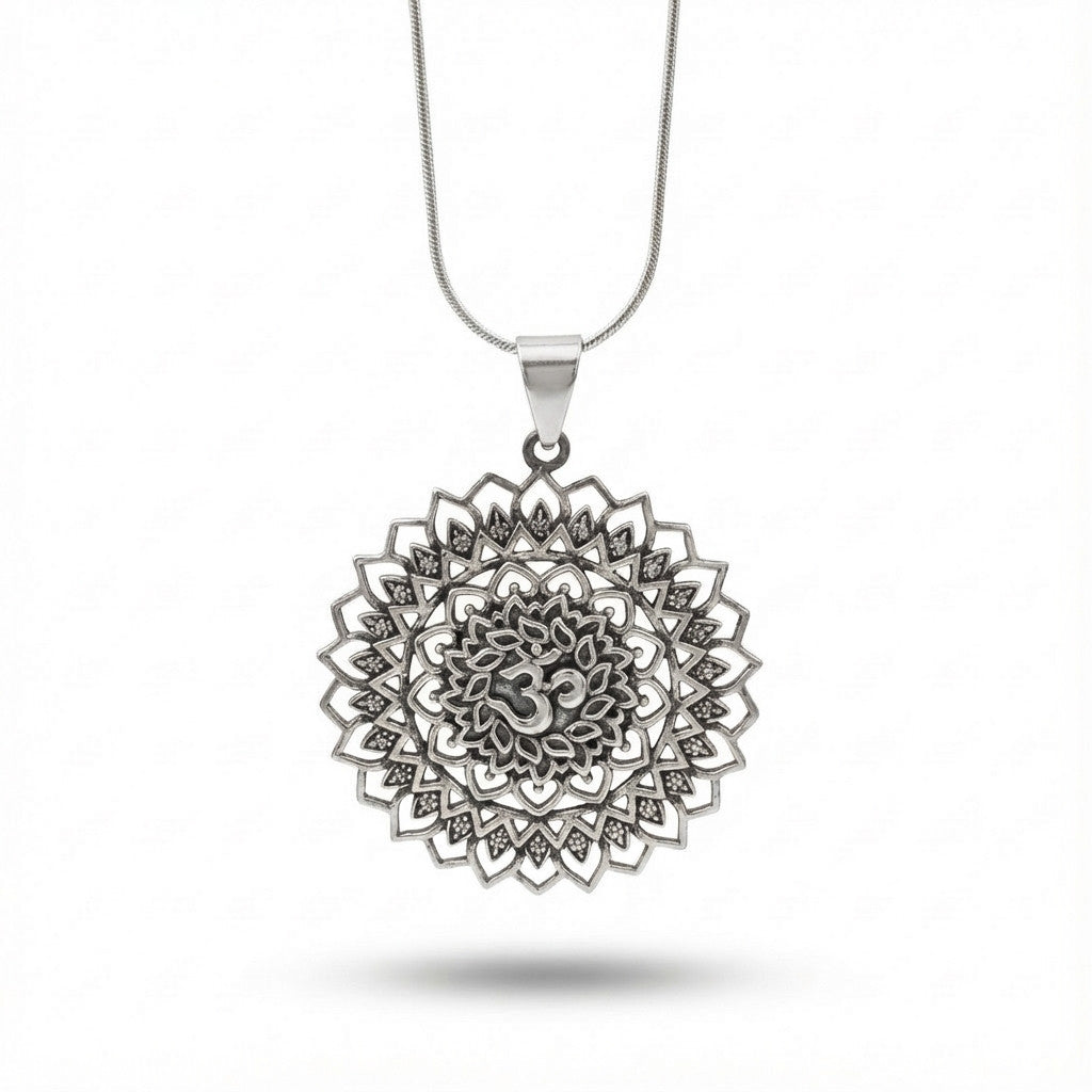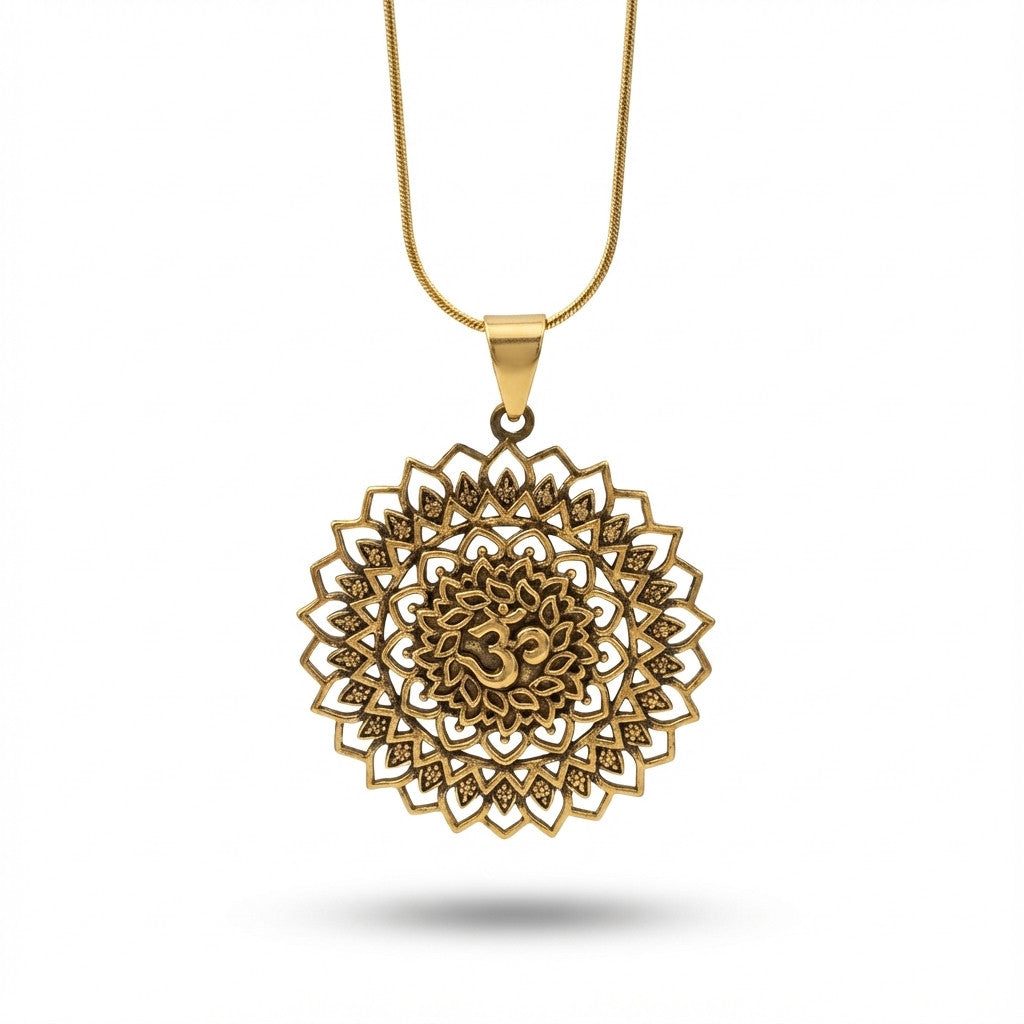 שרשרת עדינה עם תליון מנדרלה מעוצב בפרטים מדויקים, במרכזו סמל ॐ (אום) — סמל של שלווה, איזון וחיבור פנימי. שילוב של עיצוב רוחני עם מראה נקי שמתאים ליום-יום ולסטייל רגוע.