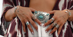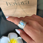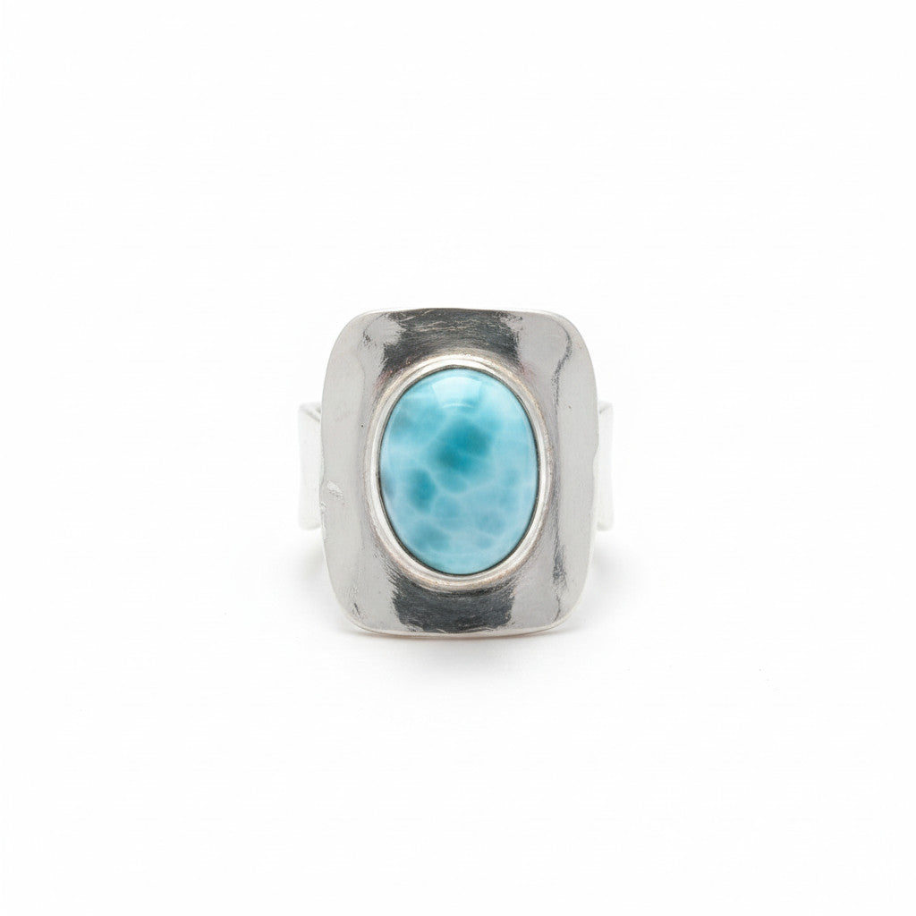 טבעת כסף עבה מרוקעת משובצת באבן לרימר אשר מסמלת רוגע, שלווה וחיבור פנימי