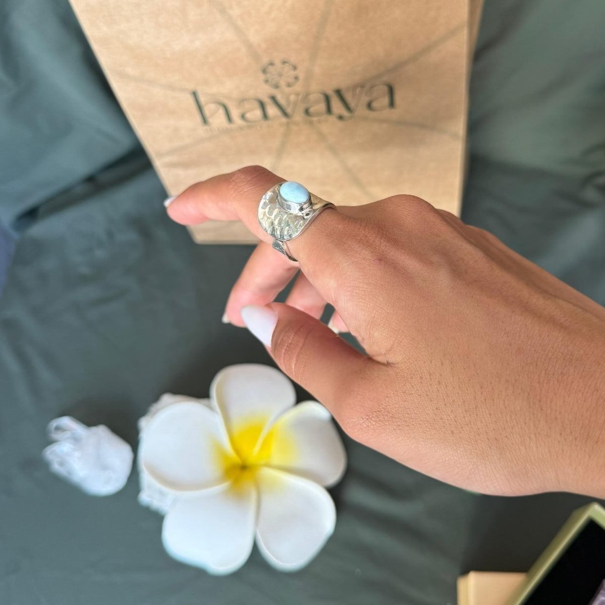מחיר ליחידה / לכלטבעת כסף עבה מרוקעת משובצת באבן לרימר אשר מסמלת רוגע, שלווה וחיבור פנימי