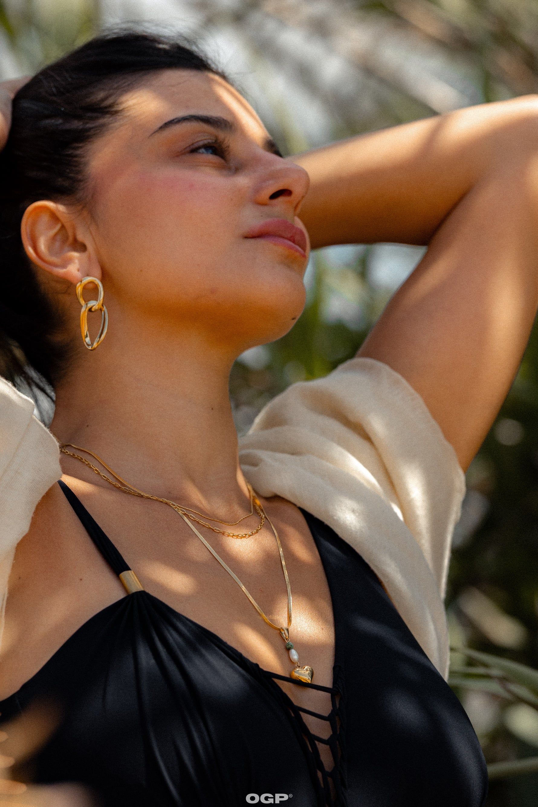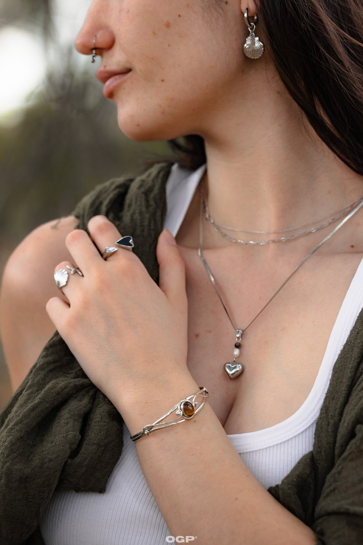 שרשרת סטיינלס סטיל בשלוש שכבות, בעיצוב עדין ומדויק. התליון המרכזי – לב כסוף עם נגיעה של חרוזים ירוקים – שילוב מושלם לחוק שכבות עם משמעות ואופי.