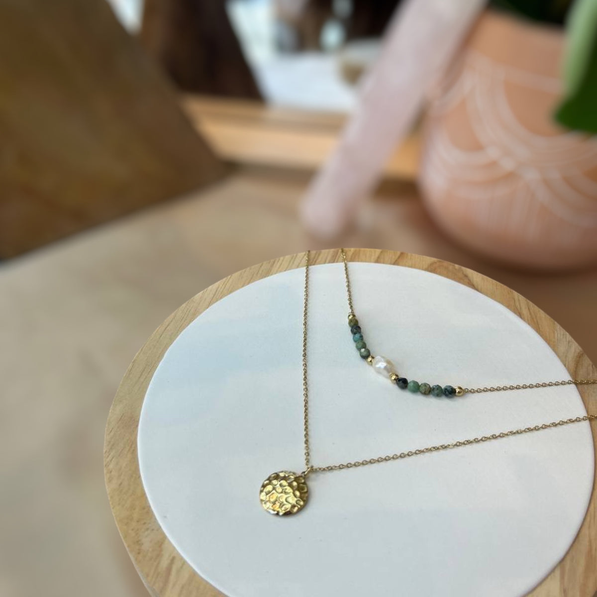שרשרת צ'וקר עם אבני אגט ופנינה באמצע ועוד תליון עגול ומרוקע בעבודת יד