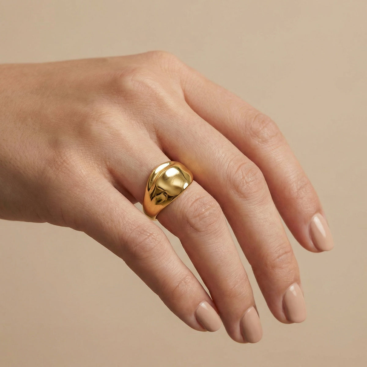 • עיצוב: טבעת רחבה במראה אורגני־פסלי, עם גלים רכים ומרקם חלק