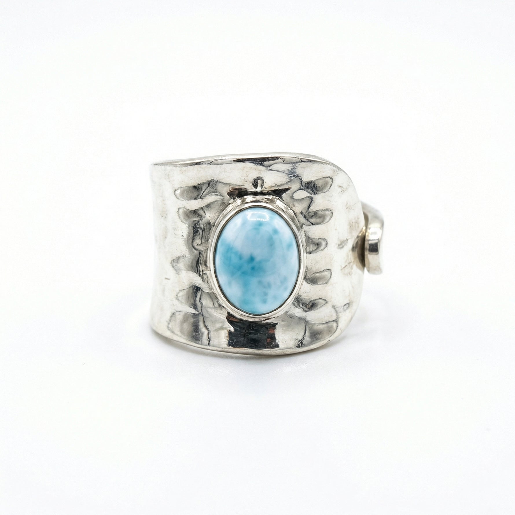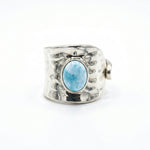 טבעת כסף עבה מרוקעת משובצת באבן לרימר אשר מסמלת רוגע, שלווה וחיבור פנימי