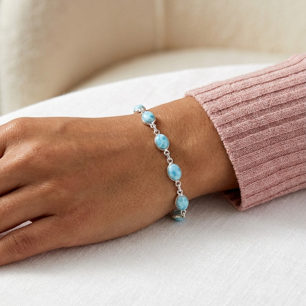 צמיד כסף 925 עדין וזורם, משובץ אבני לרימר טבעיות בגוון תכלת־ים רך.