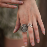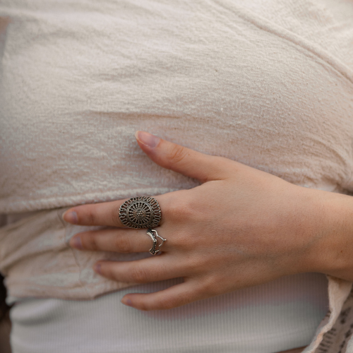 טבעת עשויה מחומר בראס (פליז) שילוב מתכות של נחושת ואבץ שיוצרות את הצבע המזהב האתני העתיק, או מציפוי כסף שאינו עמיד במים ומומלץ לשמור לשימוש ארוך וממושך